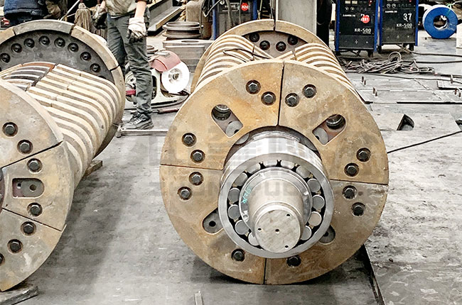 1、轉(zhuǎn)子:轉(zhuǎn)子是由主軸、錘架、圓盤、錘頭、銷軸等部件構(gòu)成,是重型錘式破碎機(jī)的主要工作部件。該轉(zhuǎn)子是支撐在兩個(gè)調(diào)心滾動的軸承上面的,圓盤上面有分布均勻的銷孔,通過銷軸來將錘頭給懸掛在轉(zhuǎn)子上面,且為了防止錘架和錘頭的晃動,需在錘架兩端壓緊錘盤或?qū)⒙菽妇o固。