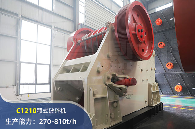 C1210顎式破碎機進料口尺寸1160×1050mm,進料粒度≤1050mm,出料大小≤75mm,電機功率132kw,時產(chǎn)量在270-810噸左右。