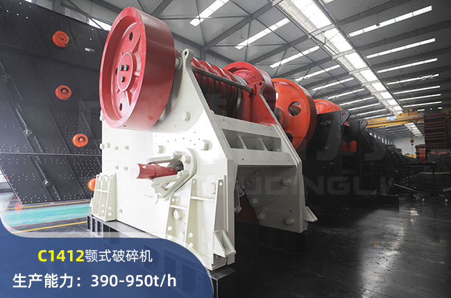 C1412顎式破碎機(jī)進(jìn)料口尺寸1400×1200mm,進(jìn)料粒度≤1200mm,出料大小≤95mm,電機(jī)功率185kw,時(shí)產(chǎn)在390-950噸左右。