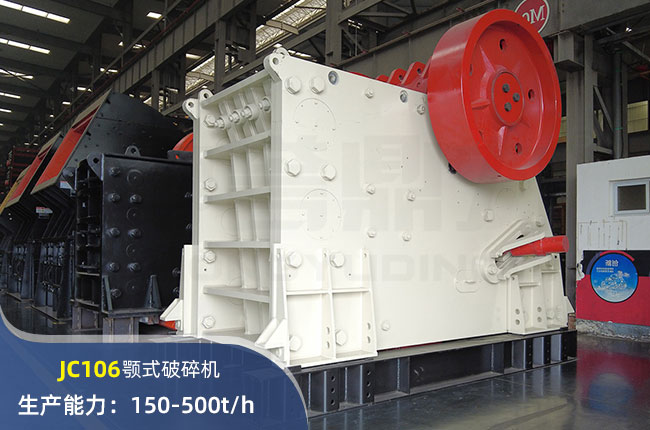 JC106顎式破碎機(jī)進(jìn)料口尺寸1060×700mm,進(jìn)料粒度≤590mm,出料大小≤70mm,電機(jī)功率110kw,時(shí)產(chǎn)量在500噸左右。