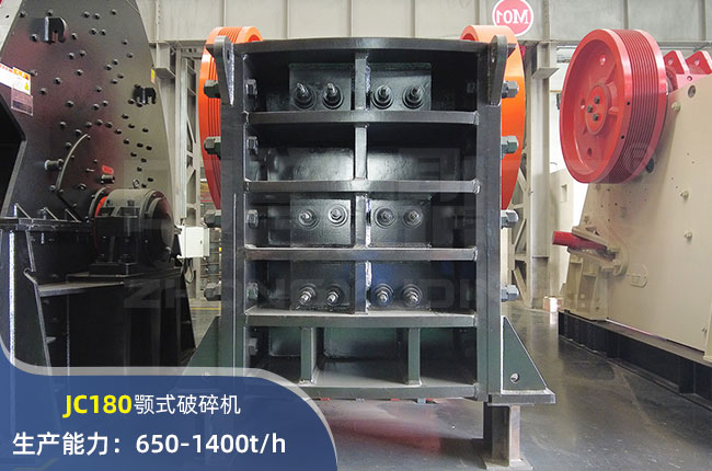 JC180顎式破碎機進料口尺寸1800×1500mm,進料粒度≤1280mm,出料大小≤175mm,電機功率355kw,時產(chǎn)量在1400噸。
