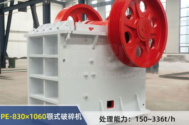 PE-830×1060鄂式破碎機進料粒度≤650mm,出料160-220mm,時產量150-336噸,電機功率為110kw(8級),設備含電機重量為30.7噸。