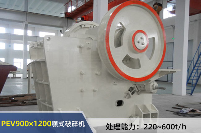 PEV900×1200顎式破碎機可處理粒度≤760mm的各類物料,出料調節范圍100-220mm之間,每小時產量在220-600噸范圍內。