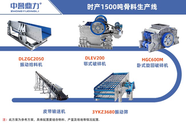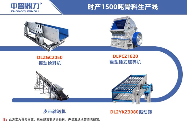一條時產1500噸的骨料生產線需要用到破碎設備、給料設備、振動篩分設備以及輸送設備和除塵設備等,設備的選擇比較靈活,本金不是很充足的可以選用重錘式破碎機,一破成型。粒度可調,不需要二破設備,本金充足可以選用鄂破+旋回破的配置方式,下面是兩種不同搭配方法: