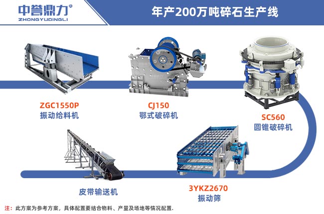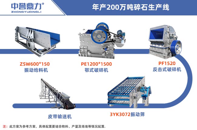 年產200萬噸的碎石廠需要用到的設備日產量在6000-7000噸左右,也就是時產800噸左右的設備,需要用到給料設備、篩分設備、破碎設備、輸送設備等,具體搭配的設備可以根據客戶產量需求進行選擇。