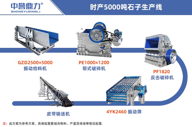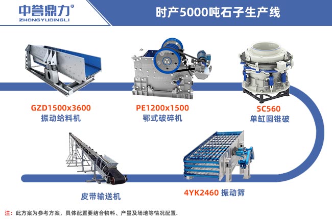時產(chǎn)5000噸石子生產(chǎn)線屬于大產(chǎn)量的生產(chǎn)規(guī)模,設(shè)備配置根據(jù)物料硬度的不同,有處理物料硬度比較大的設(shè)備配置,有處理物料硬度比較小的設(shè)備配置,總體設(shè)備配置比較靈活,可以根據(jù)客戶的需求選擇: