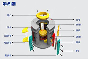 物料由機器上部垂直進入高速旋轉的葉輪內,在高速離心力的作用下,和另一部分以傘形式分流在葉輪四周的物料產生高速撞擊與粉碎,物料在撞擊后,又會在葉輪和機殼之間以物料形成渦流多次之間而粉碎,達到粉碎要求會從下部排出。