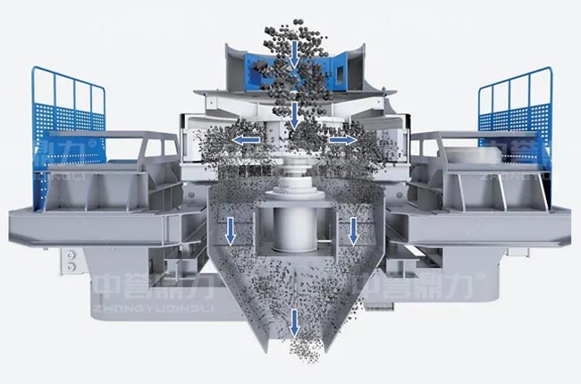 立式打砂機(jī)是中心進(jìn)料,進(jìn)料口在設(shè)備頂部,物料從進(jìn)料口進(jìn)入通過(guò)葉輪旋轉(zhuǎn)將物料拋出,實(shí)現(xiàn)石打石或石打鐵的破碎方式。