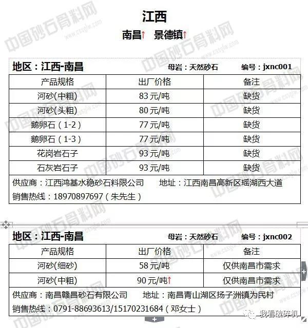 江西地區:南昌中粗河砂價格上調30元/噸,景德鎮砂石價格上調幅度在2-6元/噸。