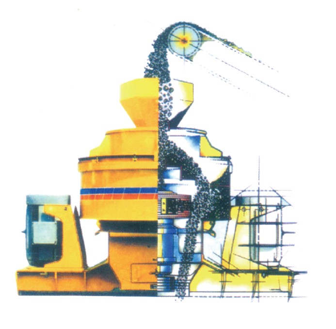 砂石物料由機(jī)器上部垂直落入高速旋轉(zhuǎn)的葉輪內(nèi),在高速離心力的作用下,與另一部分 以傘狀形式分流在葉輪四周的物料產(chǎn)生高速撞擊與粉碎,物料在互相撞擊后,又會在葉輪和機(jī)殼之間以物料形成渦流多次的互相撞擊、摩擦而粉碎,從下部直通排出,形成閉路多次循環(huán),由篩分設(shè)備控制達(dá)到所要求的成品粒度。