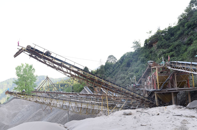 石灰巖原料通過原料倉,由振動送料機均勻的將石料送至錘式破碎機進行破碎加工,破碎后的石料經頭道并排振動篩進行篩選,一部分符合粒度要求的石料被送至成品料堆,另一部分再由二道振動篩進行篩選,得到更細的石料。四川巴中匯山建筑石料廠這條日產2000噸砂石生產線,采用“1臺一破成型的錘式破碎機+4臺振動篩”,只需一道破碎工序即可加工4種不同規格的石料,這樣的配置方案比較簡單,占地面積小、設備配置少、設備易維護保養。