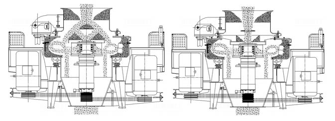 vsi制砂機分全中心進料(右圖)和中心進料伴隨瀑落(左圖)兩種進料方式,破碎方式有“石打石”(圖中轉子左側)和“石打鐵”(圖中轉子右側)兩種,破碎原理相同,不同的是石打石”成品粒形好,“石打鐵”是石料沖擊周護板破碎,比較適合中硬度的石料,破碎效率高。