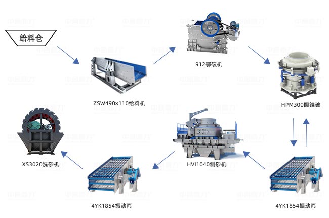 方案二:適合原料粒度≤300mm,采用破碎機、制砂機、振動篩和輸送機工藝,破碎機負責(zé)破碎、制砂機細碎制砂。