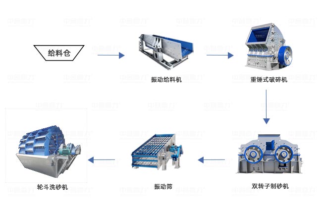 設備配置:原料倉、ZGC0938振動給料機、PCZ1308重型錘式破碎機、ZSJ1213雙轉子制砂機、2470振動篩、3020輪式洗砂機、輸送機